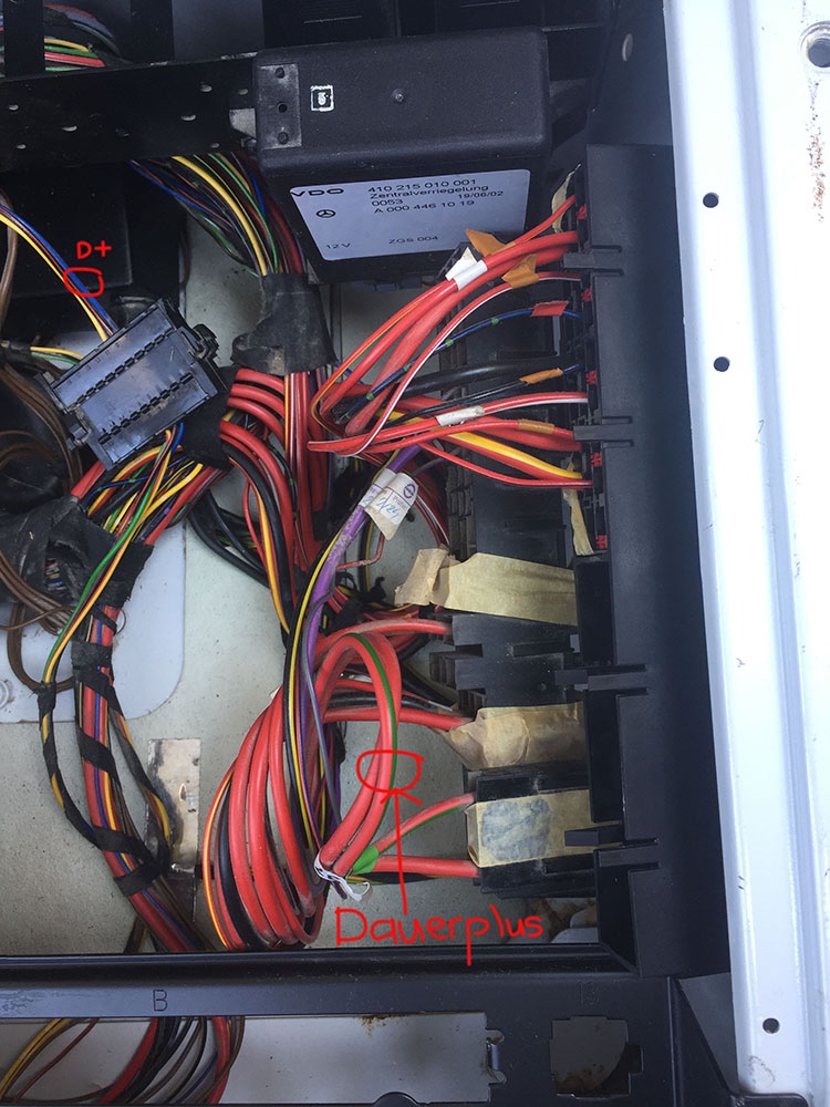 versuche eine gute D+ Abnahmestelle zu finden und bin mir sicher das bei den ganzen Kabeln, die unter dem Fahrersitz meines Bj 2003er Sprinter 316 sicher auch ein D+ dabei sein sollte.