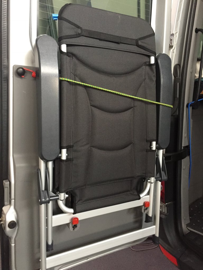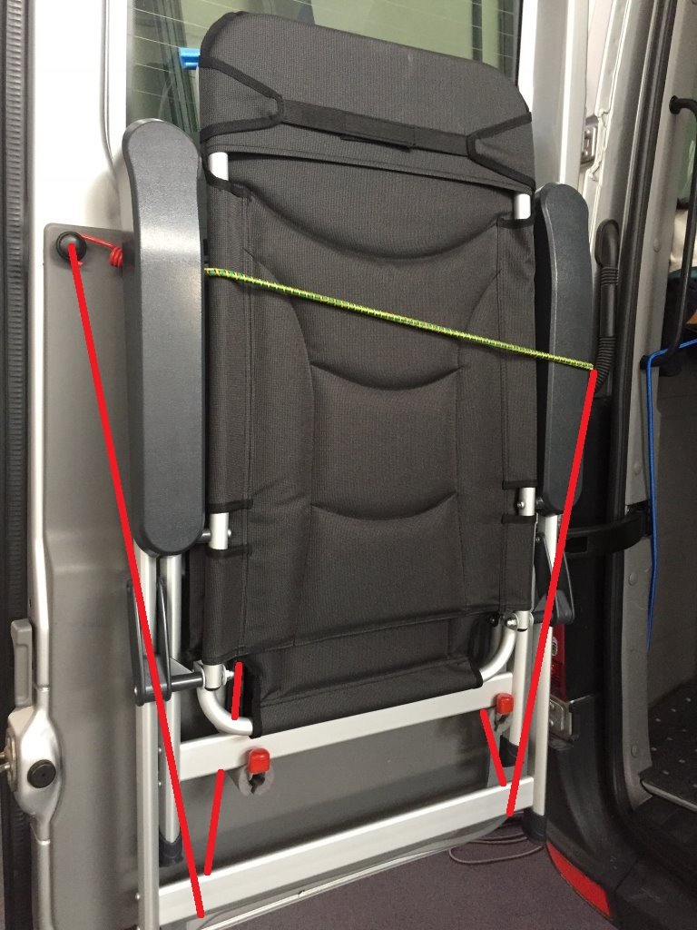 Ich hatte mich vor geraumer Zeit während eines Sprinter-Treffens von einem netten Forumsmitglied inspirieren lassen und beim letzten Sprinter-Treffen vom passablen Produkt unseres Nachbarn überzeugt. Kurzum; ich habe uns neue Campingstühle gekauft und Halter für die Hecktüren gebaut, die man nahezu rückstandsfrei wieder demontieren könnte. Man kann die Stühle auch abnehmen und die Beinauflagen bleiben an den Türen. Anders herum würde beides besser an den Türen halten, was jedoch weniger praktisch wäre.