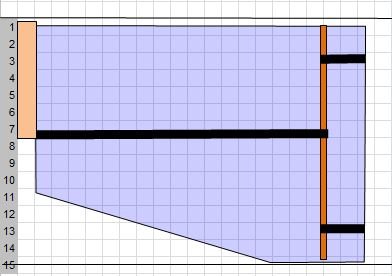 So sieht mein Plan aus, das Hubbett ist in Längsrichtung über der Sitzgruppe, die abgeschrägte Seite ist, um die Kopffreiheit von 1,97m bei zu behalten, wenn man in den hinteren teil des Fahrzeuges (Küche, Toilette) geht. Somit ist nur eine Dreipunktbefestigung des Bettes möglich.
