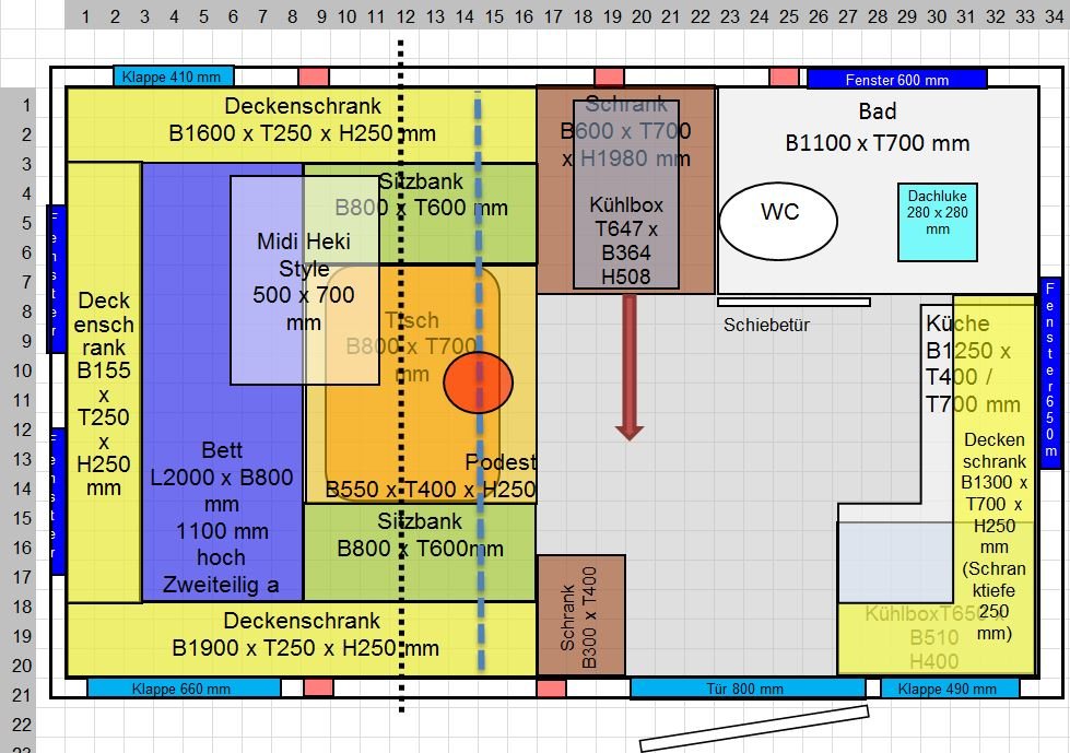 Eine Änderung der Planung ist auch nicht mehr möglich, da der Ausbau bis auf das Hubbett und dem Ausbau des Bades (die Wände stehen schon) grob fertig ist.