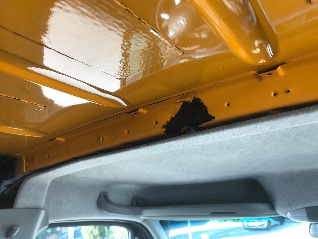 Auf der Fahrerseite ist der komplett Längsholm defekt. Das fängt bei der A Säule an und zieht sich bis ganz hinten. Es scheint, als wäre der früher mal komplett eingedrückt gewesen und das sogar so sehr, dass die Dachspriegel verbogen sind.