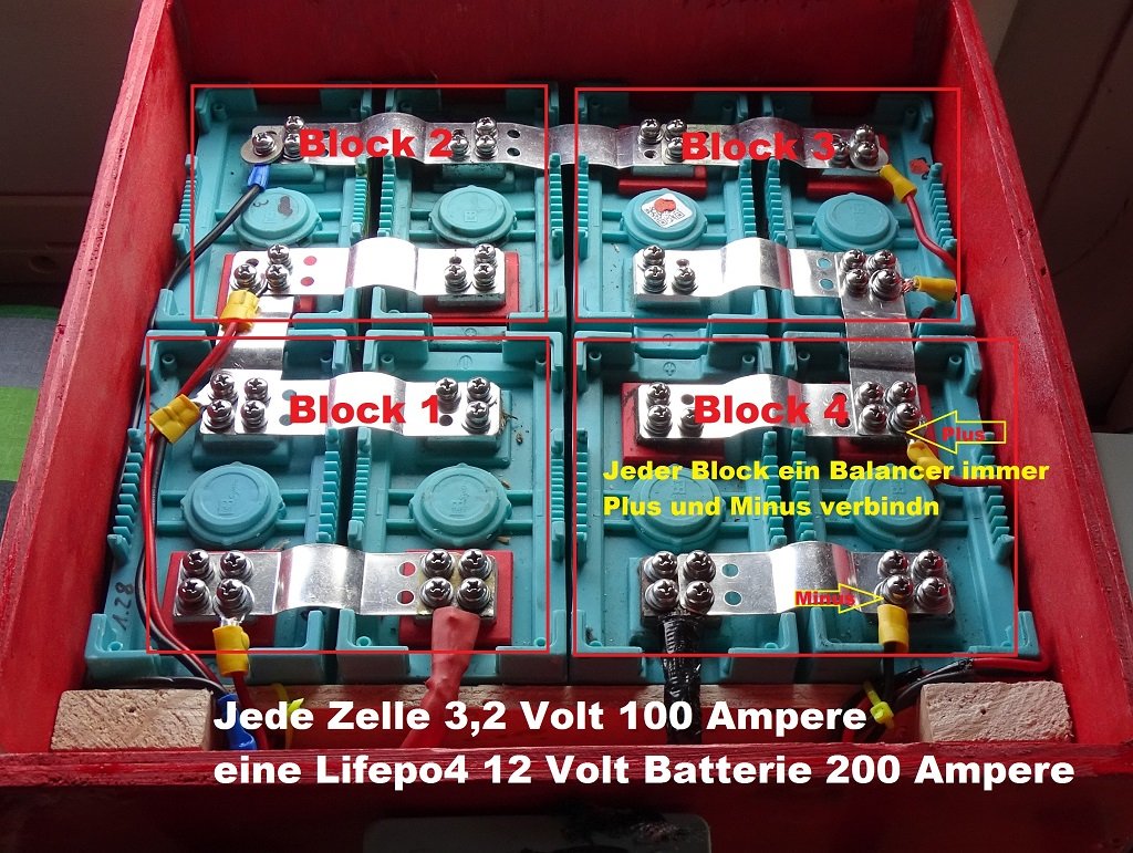 Was braucht man den alles um sich die Batterie selbst zu bauen ?wuestenhans hat geschrieben: 25 Sep 2022 14:50 Habe jeweils 2 Zellen zu einem Block mit einem Balancer von Notnagel verbunden. Alle 4 Blöcke ergeben 12 Volt, 200 Ampere.