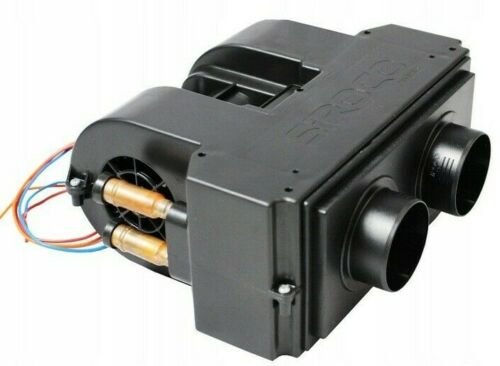 Obwohl unsere letzte Reise in den Süden ging, gab es doch Bedarf, hin und wieder die Heizung anzuwerfen. Ich habe im Motorraum eine Binar 5S Wasserheizung verbaut, mit der ich sowohl den Motor vorwärmen, als auch hinten heizen kann. Hinter dem Beifahrersitz habe ich einen solchen Wasser-Luft-Wärmetauscher verbaut: