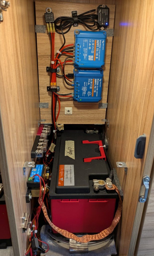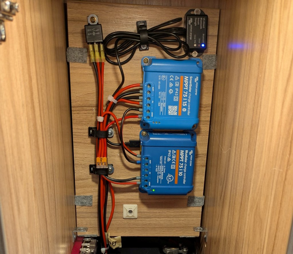 Um die Erreichbarkeit zu verbessern, habe ich diese Erweiterung an die Unterseite des Regalbodens über der vorderen Batterie montiert. Der 75/15 lädt die beiden LiFePo4 mithilfe einer Solartasche mit 125 WP.